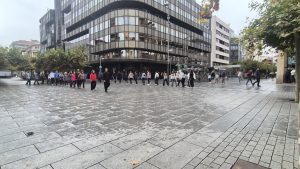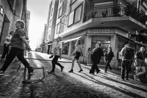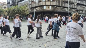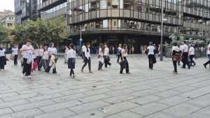 Walking and (almost) nothing else. Walking through public spaces. Walking alone. Walking as a group, or as several groups. Walking without being noticed. Walking and being noticed (seen, heard, witnessed). Walking as a form of protest (against what?). Walking with a goal. Walking without a goal. Stop walking. Walking again. Walking without stopping.